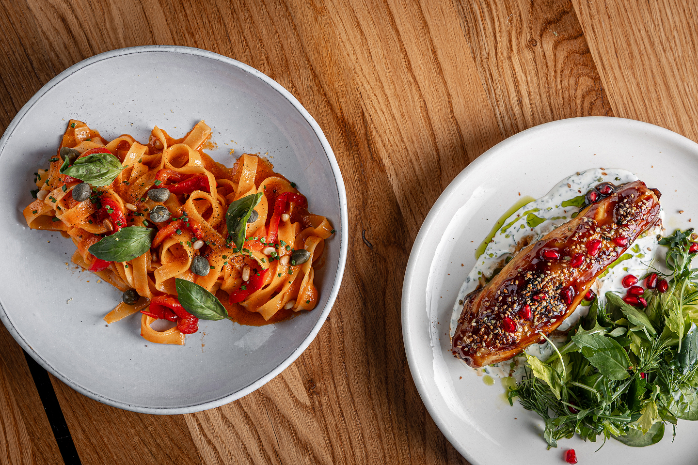 Для самых голодных: фетучини с печеным перцем и кедровыми орешками под соусом ромеско (850₽) и цветная капуста с кунжутным соусом (490₽) и только на Дмитровке - вегетарианский бургер с растительным мясом (770₽).